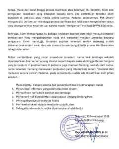 Klarifikasi dari Kepala Sekolah SMPN 3 Sidoarjo tertuang dalam surat berkop SMPN 3 Sidoarjo. Adapun klarifikasi dari Kepala Sekolah SMPN 3 Sidoarjo tertera dibawah ini :